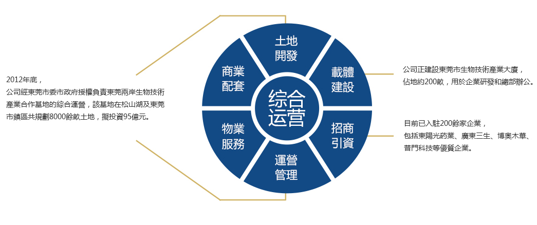 產業(yè)園的綜合運營,包括產業(yè)園的土地開發(fā)、載體建設、招商引資、運營管理、物業(yè)服務和商業(yè)配套等相關工作。2012年底,公司經東莞市委市政府授權負責東莞兩岸生物技術產業(yè)合作基地的綜合運營,該基地在松山湖及東莞市鎮(zhèn)區(qū)共規(guī)劃8000餘畝土地,擬投資95億元。目前已入駐200餘家企業(yè),包括東陽光葯業(yè)、廣東三生、博奧木華、普門科技等優(yōu)質企業(yè)。公司正建設東莞市生物技術產業(yè)大廈,佔地約200畝,用於企業(yè)研發(fā)和總部辦公。